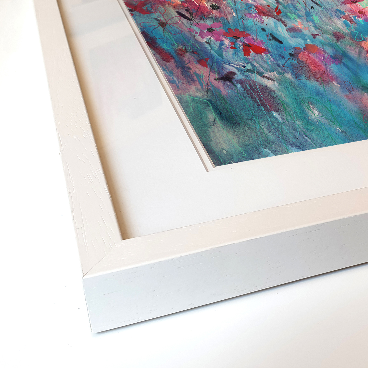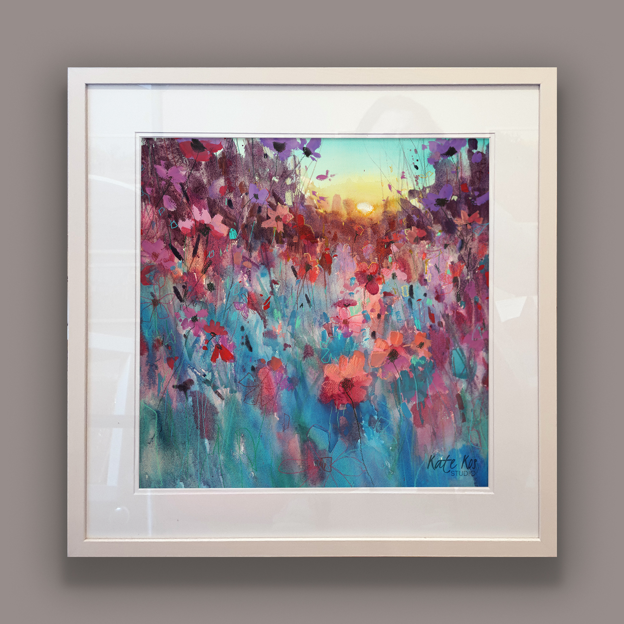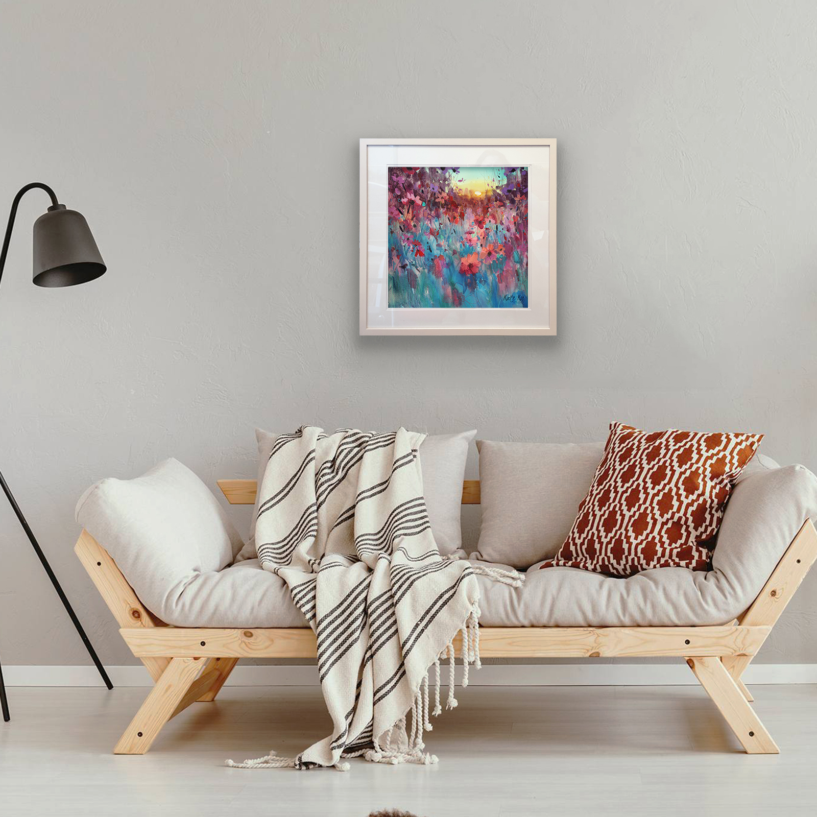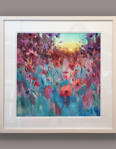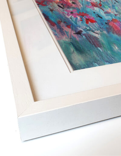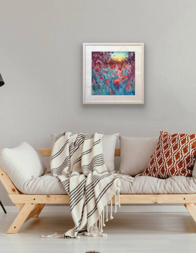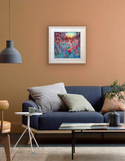 Cool blues and soft violets sit against a gentle haze, with pinks catching on the petal edges. The stems move in loose marks, then settle into sharper lines that pull you in. It’s that quiet minute when the day exhales and colour hangs in the air. Calm on the wall, but never flat, it rewards a slow look and keeps giving as the room light changes. Part of the Late Summer collection.