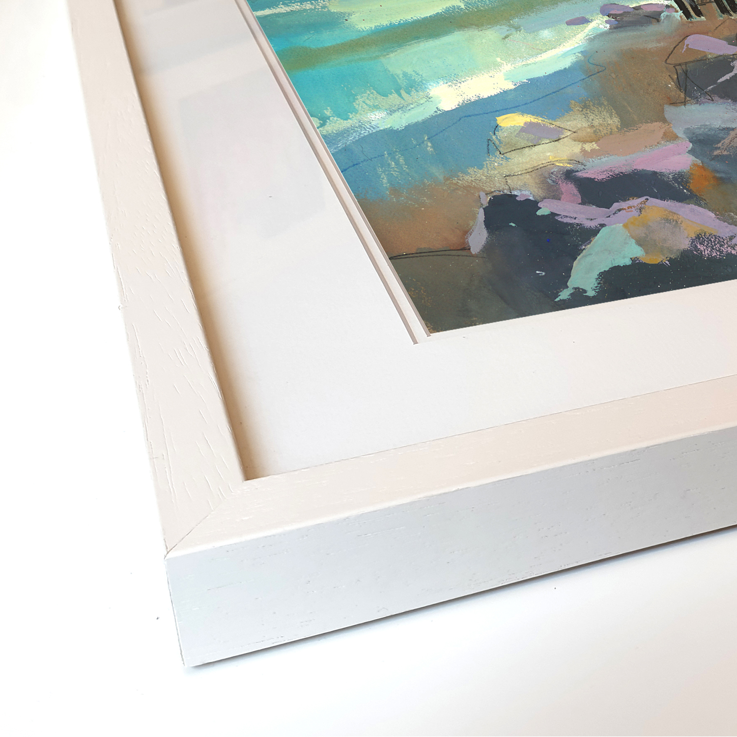 - Double matted and framed in off white/limed wooden frame