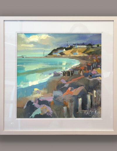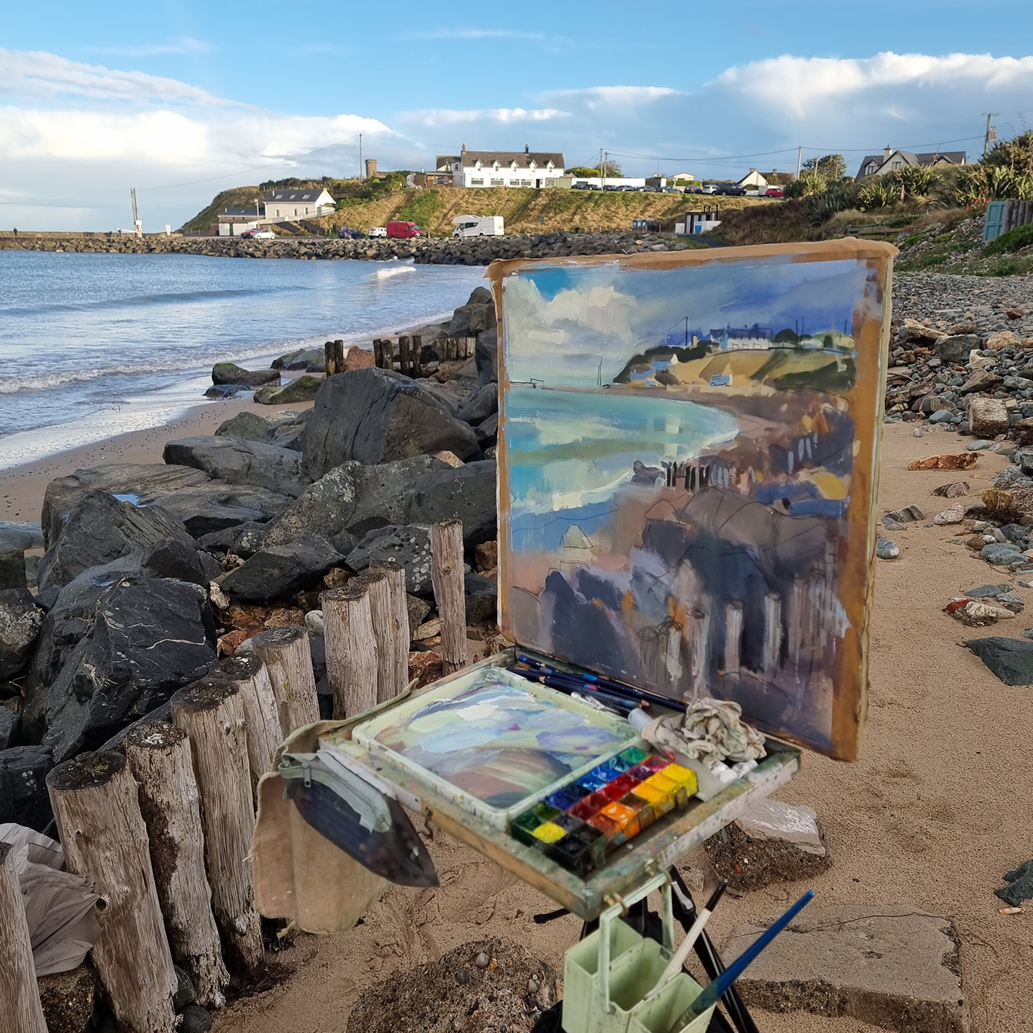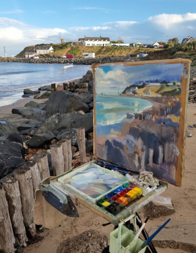 Cahore gave me a proper mix that day – a few showers, then bright spells, then showers again. While I was painting I kept getting pulled away by this absolutely massive rainbow over the sea. I took photos, grabbed a quick video, and then immediately regretted not leaving more sky so I could sneak it in. Still, the painting stayed with what was in front of me – that coloured run of rocks on the right and across the front, the sea sitting to the left, and those soft clouds throwing reflections through the wet ground.