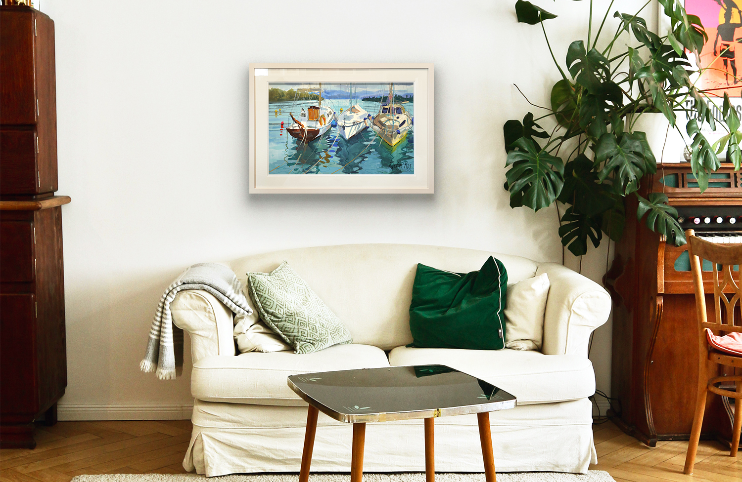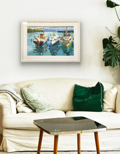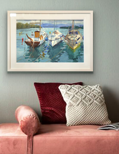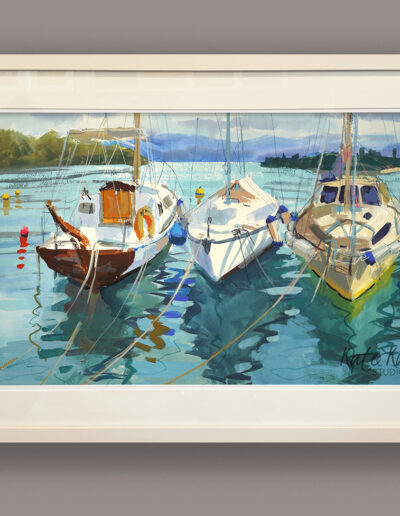 This one was painted in Corfu – three sailing boats resting quietly after a passing shower. The day started bright, then turned to soft drizzle, so like home in Ireland I almost laughed. The mountains across the water, cobalt blue and hazy, could’ve been Greece or Albania – didn’t really matter. When I was packing up, I noticed the last boat was called Kaczucha. It made me smile – such a Polish name, one my uncle would’ve loved. A bit worn, full of gadgets, solar panels, and charm. It had real character, and somehow the whole scene felt like a mix of both my worlds.
